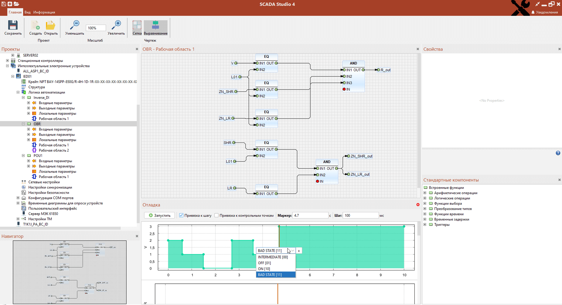 Настройка и проверка логических блоков осуществляется с помощью продвинутого отладчика в SCADA Studio. Отладчик позволяет сформировать необходимый сценарий изменения входных переменных для контроля значений на выходе алгоритма.